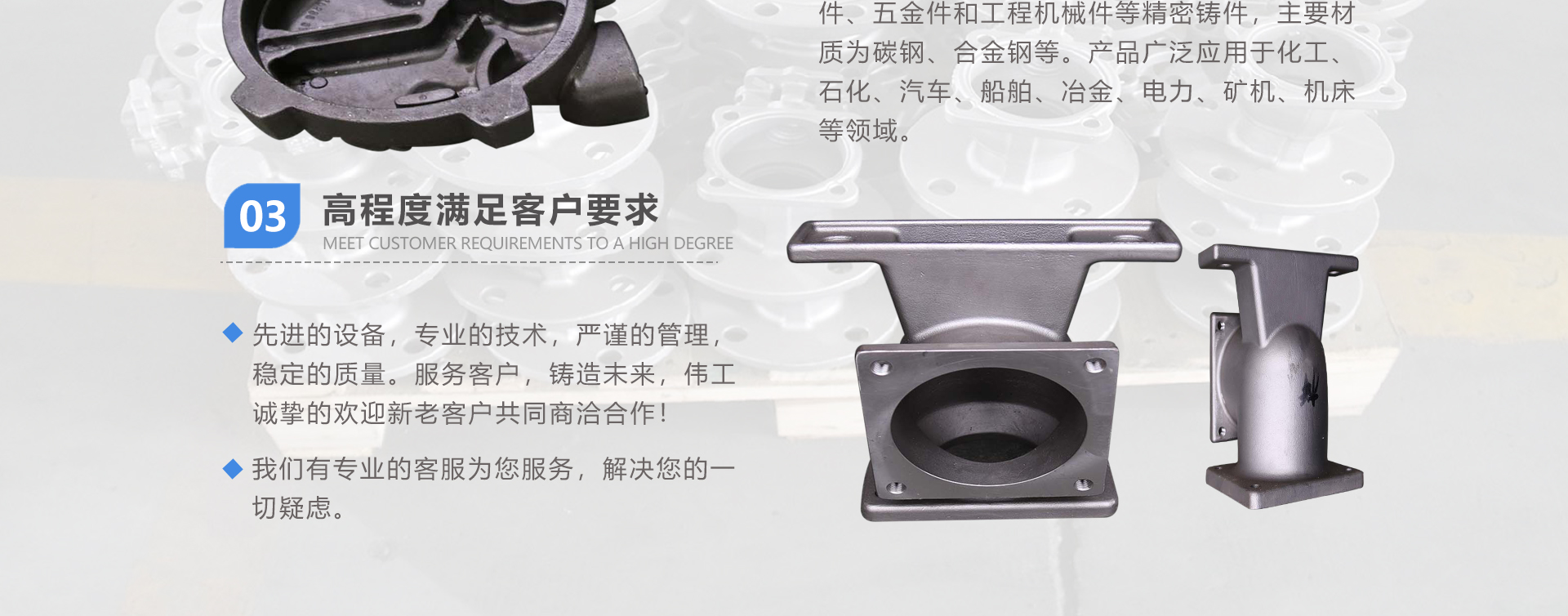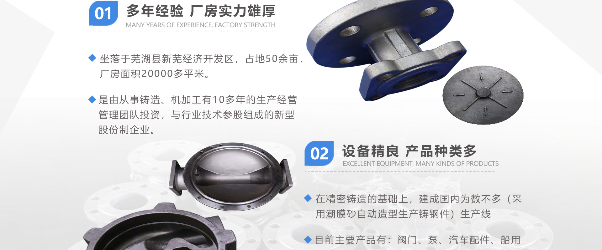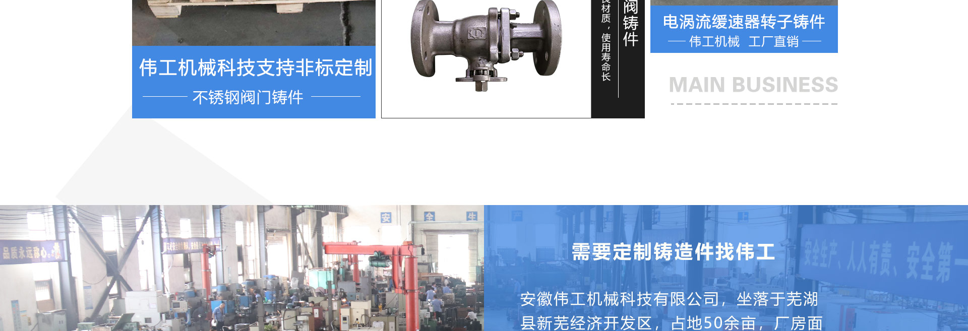 安徽偉工機(jī)械科技有限公司,坐落于安徽蕪湖新蕪經(jīng)濟(jì)開(kāi)發(fā)區(qū),是一家専業(yè)從事鑄造產(chǎn)品設(shè)計(jì)、研發(fā)、生產(chǎn)、銷售于一體的企業(yè),公司為客戶的產(chǎn)品提供多樣的技術(shù)支持與設(shè)計(jì),公司主要鑄造技術(shù)有潮模砂鑄造、硅溶膠精鑄工藝。主要產(chǎn)品有:不銹鋼閥門(mén)配件、泵閥配件、汽車配件、工業(yè)管道配件、工程機(jī)械配件、汽車配件等。材質(zhì)為:低合金鋼、304、316、316L、鉻鉬鋼、哈氏合金、碳鋼、雙相鋼等。公司已先后通過(guò)ISO9001和TS16949等多種體系審核,以完備的管理手段和齊全的檢測(cè)設(shè)備滿足客戶需求,進(jìn)的設(shè)備,専業(yè)的技術(shù),嚴(yán)謹(jǐn)?shù)墓芾恚€(wěn)定的質(zhì)量。服務(wù)客戶,鑄造未來(lái),偉工誠(chéng)摯的歡迎新老客戶共同商洽合作